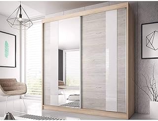E-MEUBLES Armoire de Chambre avec 2 Portes coulissantes, Miroir et Verre Blanc | Penderie (Tringle) avec étagères (LxHxP): 183x218x61 Ben 32 (Sonoma)