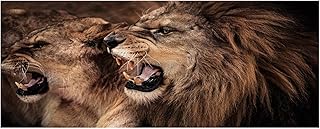 Tulup Impression sur verre 125x50 cm Image Tableau Photo décorative panoramique pour la cuisine et le salon - Animaux - Lions Rugissants - Brun